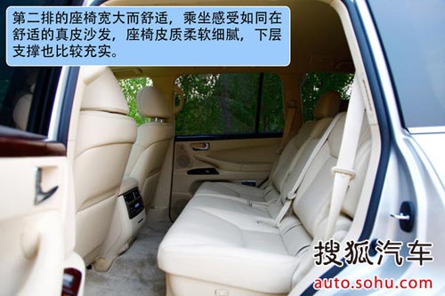 雷克薩斯LX570的第二排座椅可以給乘客提供一個如同豪華轎車后排的乘坐舒適感,寬大而柔軟的座椅如同在客艙內配置了一個舒適的沙發,真皮材質細膩而柔軟,但下層的填充物有著比較好的支撐,并不會讓身體陷在座椅中。除了座椅可以電動前后移動,靠背也可以大角度調整,給乘客一個更加安逸的乘坐姿勢。