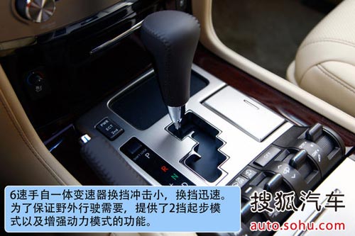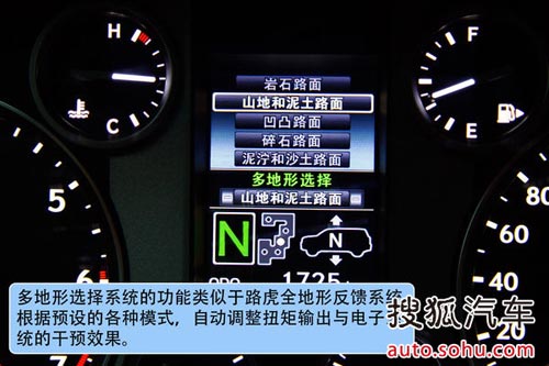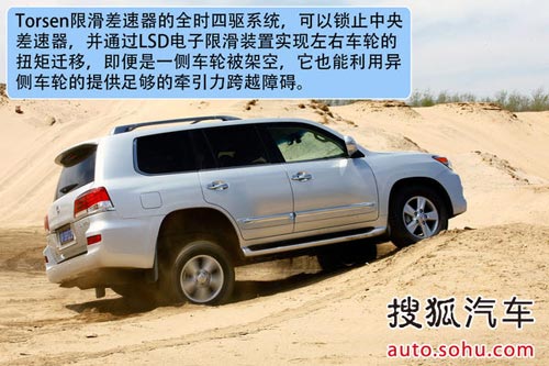 雷克薩斯LX570出色的野外通過能力來自于它采用了具有Torsen限滑差速器的全時四驅系統,可以手動選擇低速四驅和高速四驅模式,并具備中央差速鎖,而左右兩個車輪上的扭矩遷移則依靠LSD電子限滑裝置實現。多地形選擇系統的功能類似于路虎全地形反饋系統,根據預設的各種模式,自動調整扭矩輸出與電子系統的干預效果。
