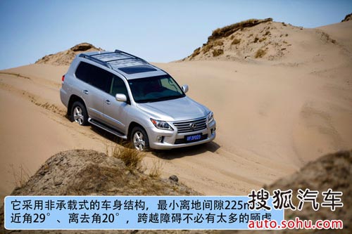 雷克薩斯LX570也能稱得上是一款專業級SUV,越野原本就是它與生俱來的天性。非承載式的車身結構,這是為越野準備的標準的車身結構。225mm的最小離地間隙,以及接近角29°、離去角20°的設計,你可以毫無顧慮去跨越障礙。