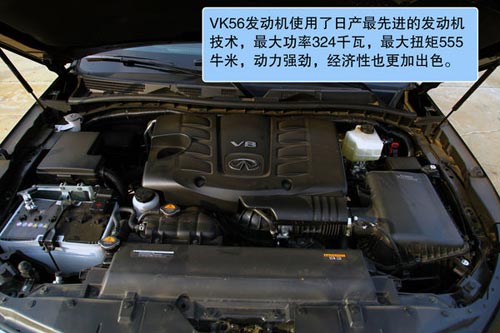 英菲尼迪QX56使用的VK56發動機,取得了眾多專利技術,與日產著名的VQ35發動機同樣聲名遠揚,只不過它是北美人鐘情的V8發動機。連續可變氣門正時控制系統(CVTCS)以及連續可變氣門升程技術(VVEL),早已在著名的VQ35發動機上得到了認可,而VK56發動機更是加入了汽油缸內直噴技術,使其成為了目前技術最為先進的V8發動機之一,而它不僅提供了324千瓦的最高功率,和555牛米的最大扭矩,更使燃油經濟性比上一代車型提高了10%。