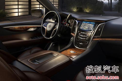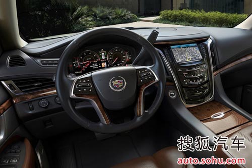 內飾方面,奢華的設計無處不在,大面積的木紋飾板配合鋼琴漆和鍍鉻亮條打造的中控臺顯得非常上檔次,而由于車身尺寸的緣故,即使是密布功能鍵整個中控臺看上去也并非顯得凌亂。值得一提的是,全新一代凱雷德標配了凱迪拉克全新的CUE車載人機交互系統和12.3英寸的顯示器。