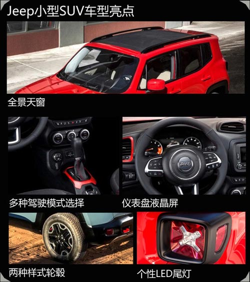 Jeep品牌旗下小型SUV擁有了諸多亮點,在同級別車型中可以用“逆天配置”來形容。其外形設計與牧馬人十分類似,同時全景天窗在同級別車型中運用并不算多;多種駕駛模式也是作為一款SUV車型必備的利器;中控儀表盤的液晶屏與老大哥大切相同;而個性化的LED尾燈設計也頗具想象力。