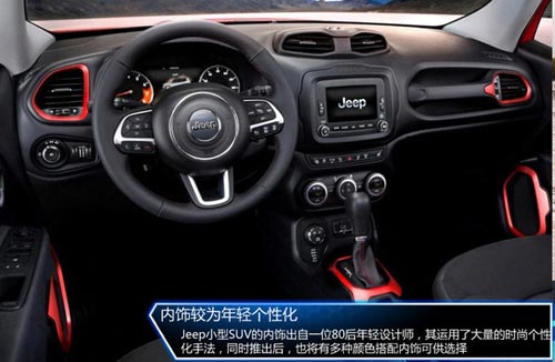 Jeep小型SUV采用了前衛的造型,紅色與黑色的融合,獨具風格造就了更加時尚個性化的內飾,同時造型獨特的中控臺整體給予了車輛更多的花哨,中控區域設計較為簡潔,而儀表盤的液晶屏幕與大切諾基十分相似,其整體設計更加適合年輕人的口味。