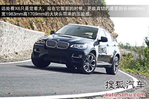 寶馬將X6定義為全能轎跑車。將龐大的身形和轎跑車綁在一起理解確實有些困難,但感受過它的駕駛樂趣之后,很自然的對這種做法產(chǎn)生了一些認(rèn)同感。站在它面前的時候,更能真切的感受到長4880mm寬1983mm高1709mm的大塊頭帶來的壓迫感。