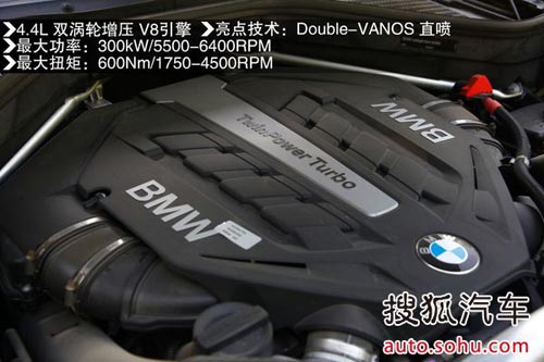 寶馬為其配備的4.4L雙渦輪增壓V8引擎,能夠在5500rpm-6400rpm時輸出300kw的最大功率,高達(dá)600Nm的峰值扭矩出現(xiàn)在1750rpm,扭矩平臺一直持續(xù)至4500rpm。引擎的強(qiáng)勁輸出通過8速自動變速器傳遞至四個車輪。緊密的齒比排列確實使X6的升換擋動作變得十分平順,減擋補(bǔ)油的動作也很對速度愛好者的胃口。
