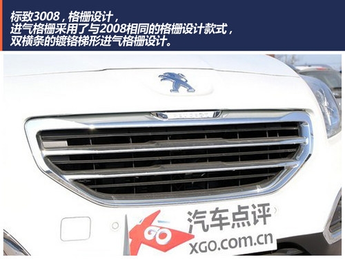 東風標致3008的進氣格柵采用了與2008相同的格柵設計款式,雙橫條的鍍鉻梯形進氣格柵設計。