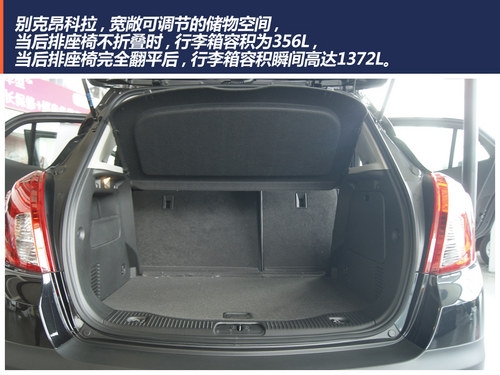 別克昂科拉寬敞可調節的儲物空間,6/4分割可完全翻平的后排座椅,當后排座椅不折疊時,行李箱容積為356L,當后排座椅完全翻平后,行李箱容積瞬間高達1372L。