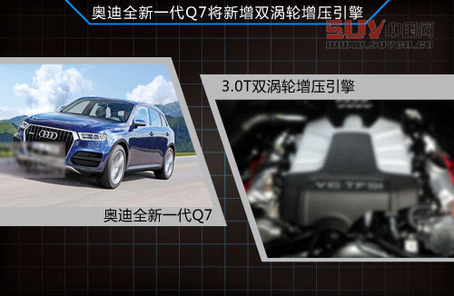 目前2014款Q7搭載了兩種排量引擎,其中3.0排量發動機使用了渦輪增壓以及機械增壓技術,6.0排量發動機則僅使用了機械增壓技術。全新一代Q7推出后還有望增加一款3.0升雙渦輪增壓引擎來取代現有的同排量機械增壓發動機,功率也將提高20%。