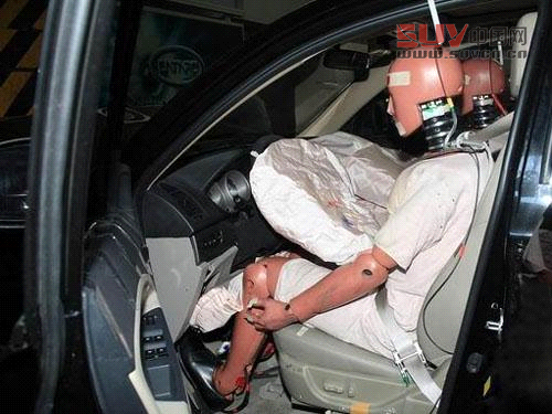 駕駛員假人坐姿基本正常,假人頭部與氣囊接觸印記明顯,駕駛員膝部安全氣囊正常打開。