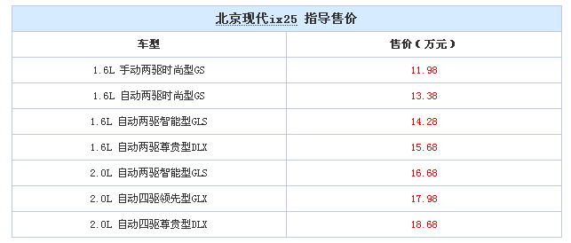 此次上市的北京現代ix25分為1.6L以及2.0L排量,按配置差異細分為7款車型,其中1.6L車型有4款,而2.0L車型則有3款。從車系架構不難看出,1.6L排量車型將會擔負起北京現代ix25的主要銷售任務。