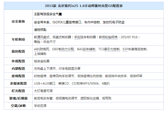 在我撰寫過的購車手冊里面,沒多少車的最低配車型是性價比高,并且值得購買的,它們的推出更多是為了拉低銷售門檻,而北京現代ix25 1.6L手動兩驅時尚型GS也沒有打破慣例。作為ix25的最低配車型,它的售價為11.98萬元,價格并不吸引,而且從下面的表格可以看到,它的配置并不顯得光鮮,一切都以滿足最基本用途為主。