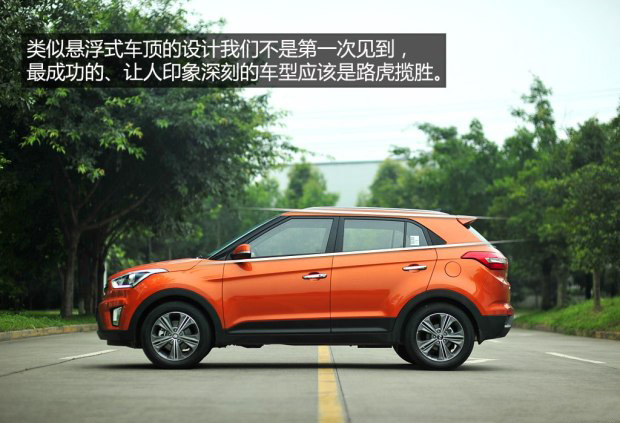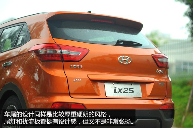 然后是車身側面。它采用了懸浮式車頂的設計,看著不乏動感。事實上,類似的設計應用得最成功、最讓人印象深刻的應該是路虎攬勝。老實說,即使現在ix25把這種設計發揮得淋漓盡致,也已經毫無新鮮感可言了。最后是車尾部分,此處同樣采用了比較厚重的設計風格,給人四平八穩的感覺。尾燈的設計感比較不錯,可以算得上是車尾的設計亮點之一,而后保險杠上的護板則增強了整個車尾的層次感。