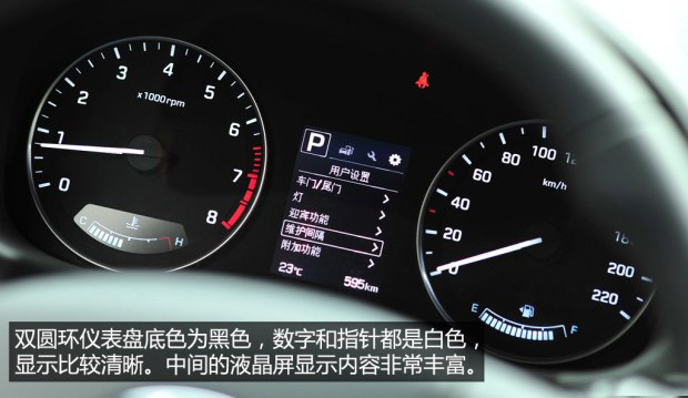 它的方向盤在造型上與名圖的有點相似,款式讓人滿意。雙圓環儀表盤的底色為黑色,數字和指針都是白色,用高對比度的色彩搭配來換取清晰的顯示效果。位于儀表盤正中央的是行車電腦液晶屏,此處可以顯示非常豐富的行車電腦設置及車輛信息。