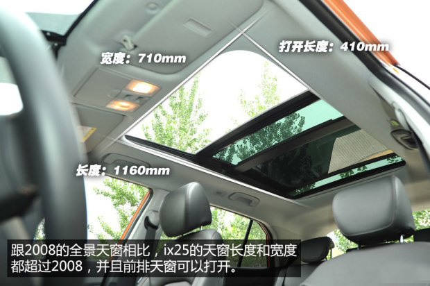ix25的7款車型里面,有多達5款配備了全景天窗。跟同級別的標致2008的全景天窗相比,它的全景天窗在采光面積上要大了不少,寬度已經完全覆蓋駕駛員和副駕駛員的頭頂,甚至連后排乘客的頭頂也在天窗的覆蓋范圍內。還有一點非常不錯,前半扇天窗是可以打開的,并且可打開面積也不小。
