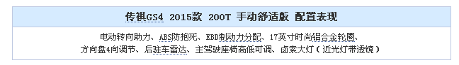 最便宜的GS4是200T 手動舒適版(因為目前GS4只搭載一款發動機,所以文章后面提及的車型我們將省略200T),廠商指導價為9.98萬元,稍稍低于10萬這個門檻。這輛最便宜的GS4在配置上的表現能否讓我們滿意呢?