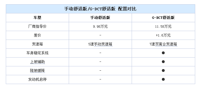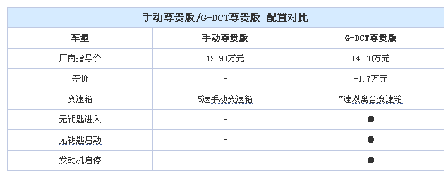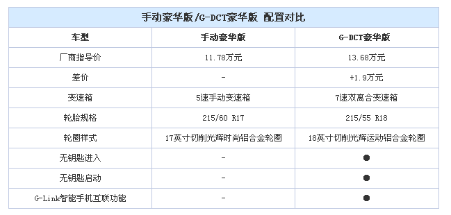 從手動豪華版車型升級到自動擋車型G-DCT豪華版的差價是1.9萬元,除了變速箱的差異之外還包括了輪胎和輪圈的升級、無鑰匙進入和啟動功能以及G-Link智能手機互聯功能。用接近兩萬塊錢升級成自動擋還是顯得代價比較高,不過考慮到配置上比G-DCT精英版高不少,所以手頭比較富余的消費者選擇它也不錯。