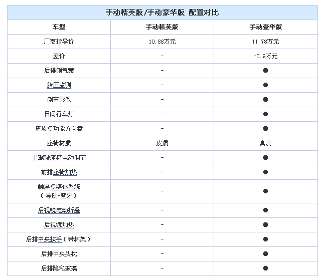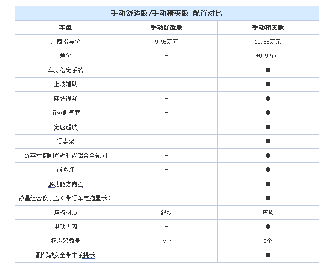 增加9千元,手動精英版的配置水平一下子提升了不少。不僅配備上了關系到行車安全的車身穩定系統和前排側氣囊,而且像定速巡航、多功能方向盤和行車電腦顯示等增加行車便利配置上也增加不少。另外還配備了皮質座椅和電動天窗等舒適性配置,外觀上也有小幅提升。這樣看來,加9千塊錢買手動精英版是個挺不錯的選擇。