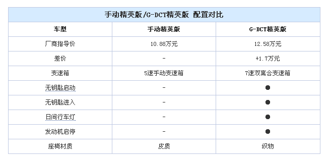 精英版的自動擋車型也要比手動擋車型貴了不少,1.7萬元的差價換來自動變速箱之外,還多了無鑰匙啟動、無鑰匙進入和發動機啟停功能,但是座椅材質又退回了織物材質。盡管多了一些配置,但精英版手動擋和自動擋車型的1.7萬元差價看起來還是有點高,相比之下手動擋車型更劃算。