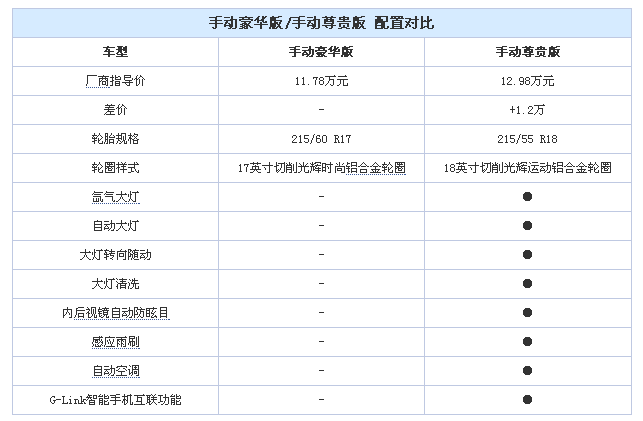 G-DCT尊貴版車型比手動檔車型多了無鑰匙進入、無鑰匙啟動和發動機啟停功能,差價為1.7萬元??v觀GS4所有車型,從手動檔升級到自動擋的差價都在1.6萬元以上,算是比較大的差距,如果您不是非自動擋車型不買,那購買同樣價格水平的手動擋車型更加劃算。