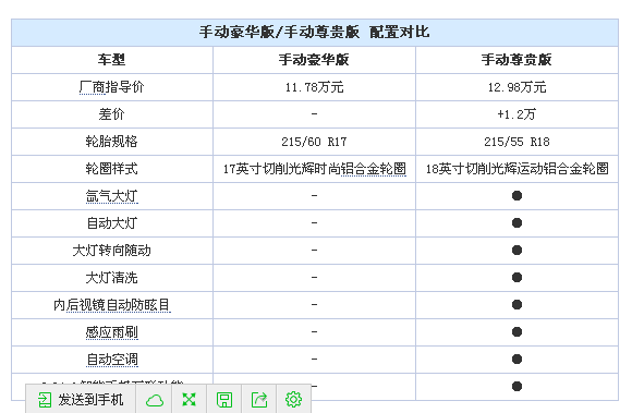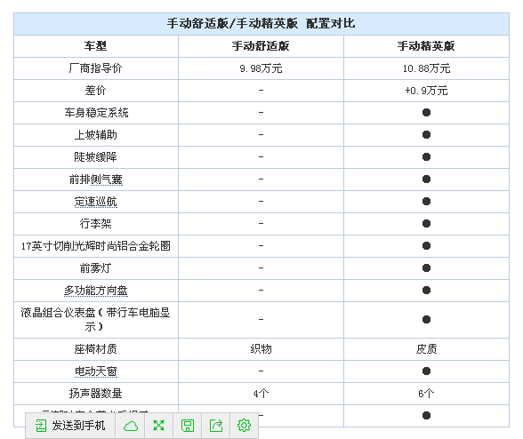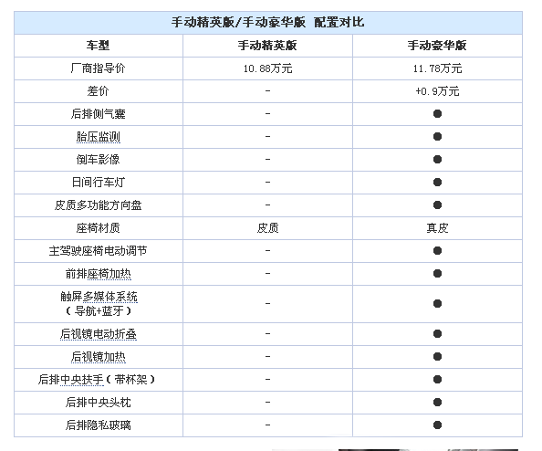 增加9千元,手動精英版的配置水平一下子提升了不少。不僅配備上了關系到行車安全的車身穩定系統和前排側氣囊,而且像定速巡航、多功能方向盤和行車電腦顯示等增加行車便利配置上也增加不少。另外還配備了皮質座椅和電動天窗等舒適性配置,外觀上也有小幅提升。這樣看來,加9千塊錢買手動精英版是個挺不錯的選擇。
