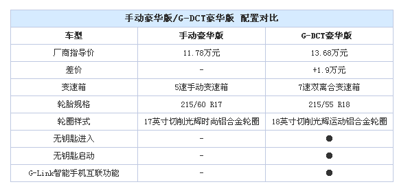 從手動豪華版車型升級到自動擋車型G-DCT豪華版的差價是1.9萬元,除了變速箱的差異之外還包括了輪胎和輪圈的升級、無鑰匙進入和啟動功能以及G-Link智能手機互聯功能。用接近兩萬塊錢升級成自動擋還是顯得代價比較高,不過考慮到配置上比G-DCT精英版高不少,所以手頭比較富余的消費者選擇它也不錯。