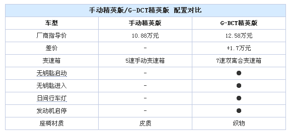 精英版的自動擋車型也要比手動擋車型貴了不少,1.7萬元的差價換來自動變速箱之外,還多了無鑰匙啟動、無鑰匙進入和發動機啟停功能,但是座椅材質又退回了織物材質。盡管多了一些配置,但精英版手動擋和自動擋車型的1.7萬元差價看起來還是有點高,相比之下手動擋車型更劃算。