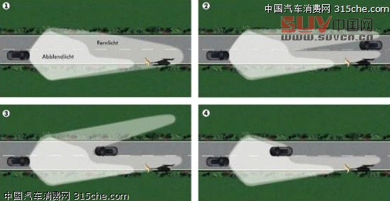 2.智能隨動轉(zhuǎn)向氙氣大燈:大燈能夠自動調(diào)節(jié)偏轉(zhuǎn),以便能夠提前照亮彎道內(nèi)側(cè)盲區(qū)。開啟條件:①打開近光燈②車速>10km/h③車輛開始轉(zhuǎn)向④向前行駛。