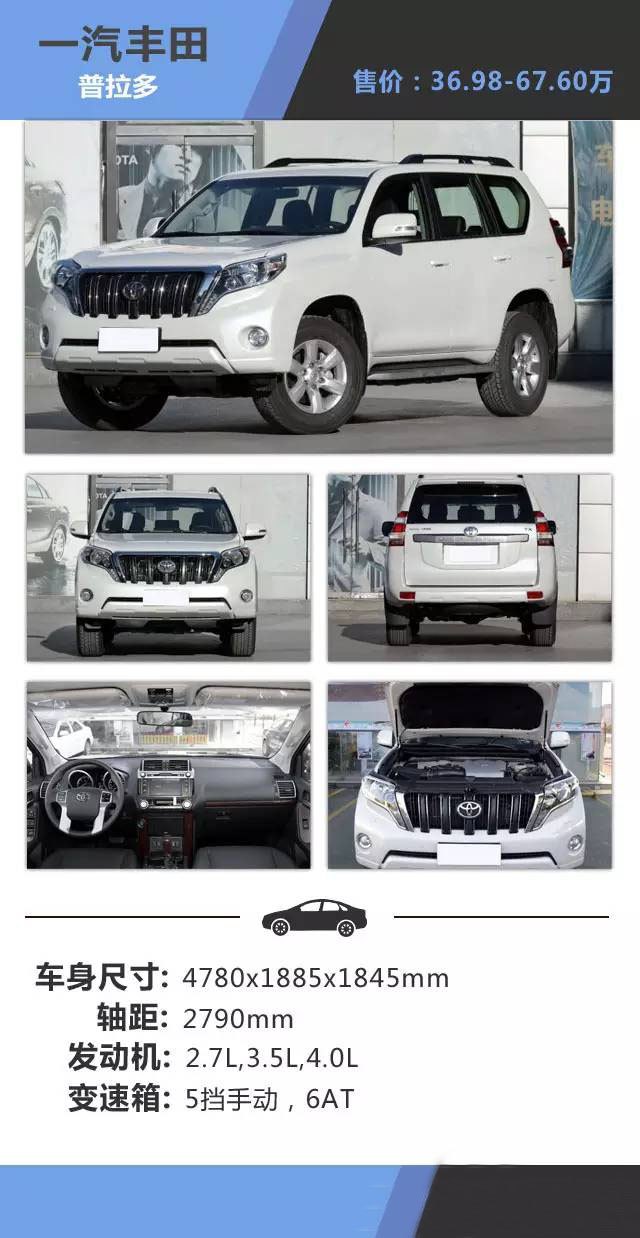 點評:相信很多人愛上普拉多都是被各種的進藏圖片吸引過來的,其外形設計就是硬派的造型,粗壯的直瀑的進氣格柵搭載柳葉狀的大燈設計具有很高的辨識度,簡潔的車身設計,一切以實用為主,中控的造型比較傳統,采用比較多的平直線條,整體比較方正,不過作為一臺起步價35萬以上的汽車,內飾的用料相比同級的車型真的相差太遠了。