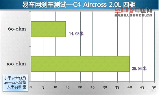 根據我們之前的測試成績,C4的0-100km/h加速時間超過12秒,但它的制動測試表現非常出色,39.86米的平均成績對于SUV來說屬于非常好的成績。