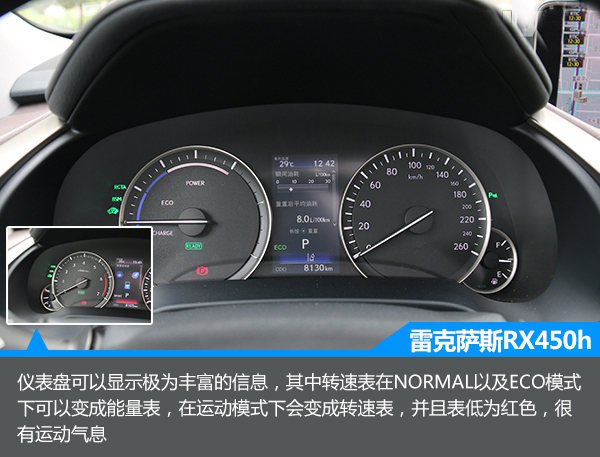 而如果您認為這就是這臺RX450h的全部實力,那就大錯特錯了,深踩油門(或者調到SPORT模式),這臺3.5L V6發動機也不會辜負您的希望,大排量發動機不會像渦輪那樣暴躁,取而代之的是絲滑、平順的加速特性,而這種非常線性的加速感會使車內人員感覺很舒服,這也是這臺RX450h所追求的感覺。編輯認為,開RX450h是一種對環保負責的生活態度,雖然有很強悍的加速能力,但是未必真的會這么激烈駕駛,看著指針在ECO附近回蕩,感受油耗降低的喜悅,這樣安靜、平順的感覺是其他車型無法比擬的。