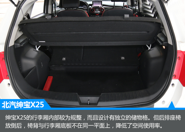 雖然紳寶X25定位于小型SUV,但其前后排的乘坐空間表現(xiàn)還是不錯(cuò)的,完全可以應(yīng)付日常使用。不過(guò)其儲(chǔ)物空間表現(xiàn)就沒(méi)那么出色了,車內(nèi)的儲(chǔ)物空間并不豐富,而且多數(shù)儲(chǔ)物格的空間比較尷尬。但是紳寶X25的行李廂儲(chǔ)物空間還比較充裕,后排座椅還支持按比例放倒功能,能夠讓儲(chǔ)物空間得到靈活地拓展。