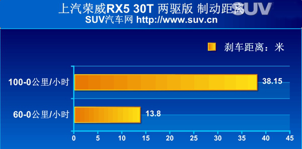 隨后,我們進行了剎車測試,除了剎車系統是否給力外,輪胎也是一個重點,榮威RX5配備了235/50R18的輪胎,供應商則是米其林Primacy3ST浩悅輪胎,靜音操控都很不錯,更寬的輪胎有利于車輛的抓地力。全力剎車后,由于重心的轉移,前懸架會被壓縮,但是前懸架依舊支撐性十足,確保車輛沒什么點頭的情況。經過多次剎車,RX5并沒有太明顯的熱衰減,車輛的制動性能依舊給力。最終,兩驅版本的剎車距離為38米,而四驅版本則達到了37.95米,成功跑進38米的“門檻”,一舉超過了那些合資對手們。