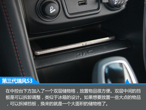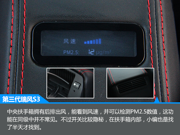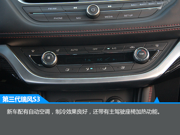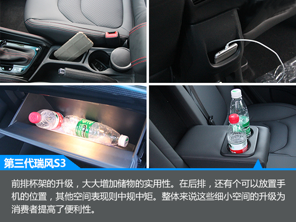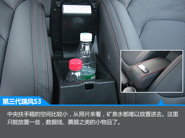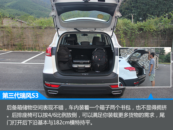 由于車身尺寸并沒有變化,所以空間只是做了些優(yōu)化。從實際效果來看,江淮瑞風S3的內(nèi)部空間得到了很好的傳承。身高182CM的模特,在前排保持正常駕駛坐姿,頭部空間有一拳多的余量。保持前排座椅不變,來到后排,膝部空間有一拳,頭部空間保持在一拳四指左右,這樣的空間表現(xiàn)可以說是非常不錯。新款座椅更加寬大,包裹性更好,美中不足的是手動調(diào)節(jié),還是有些不方便。后備箱儲物空間同樣值得肯定,另外在后備箱還增加了12V電源。