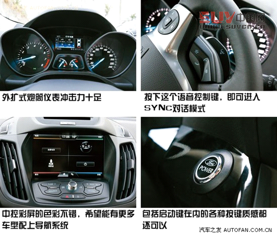 娛樂方面,翼虎提供了藍牙/USB /AUX端口/AV接口/SD卡插槽等多種方式連接隨身媒體,與之配合的是9個高保真揚聲器,讓車內總能洋溢著你所鐘情的音符。與此同時,從車頂隱藏式眼鏡盒到后排地毯下的儲物格,福特為翼虎車主提供了22種個性化儲物空間。遺憾的是,中文導航系統僅出現在頂配的翼虎車型身上,我此番所試駕到的運動型版本就沒有配備,這可是相當實用的一項配置啊,而不應歸到尊貴、豪華類。