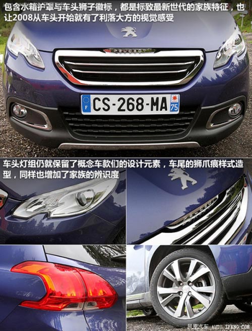 配置與208相同的底盤,全車甚至有超過2/3的部件與208共享,但2008還是擁有著非常獨特且自我的特質。相同的6角型水箱護罩車頭元素,但透過上下兩層式的設計,讓2008的水箱護罩與下氣壩呼應串聯,讓2008展現更豐富層次的大器面貌;車尾造型更能看出同中求異的特征,尾燈造型相比208的尾燈組,相同的倒C字型將車側腰線,與車尾中央橫亙之折線串連,但2008的尾燈組則擁有更大面積,迎合其整體壯碩的身形。