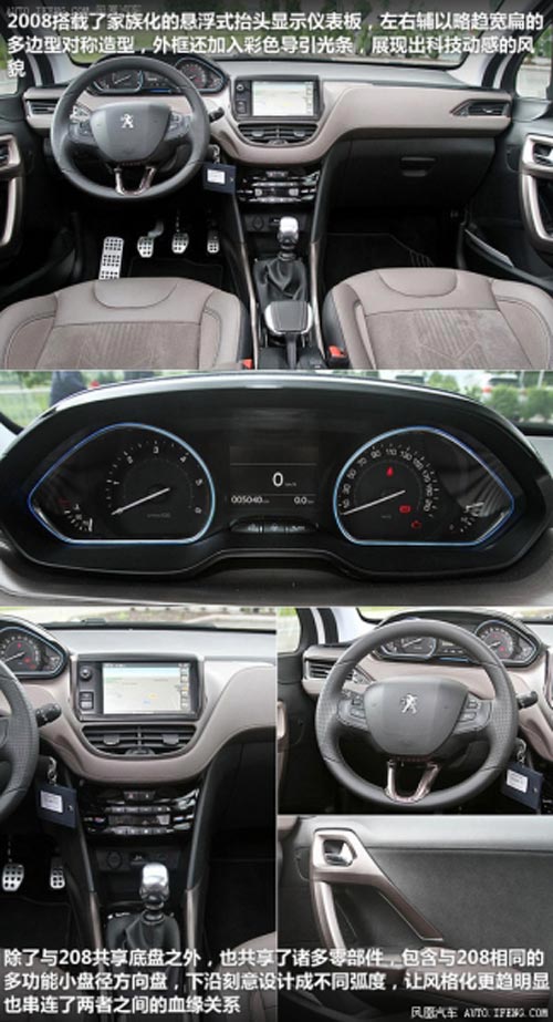 從駕駛座室看過去2008與208相同的多功能小盤徑方向盤,下沿刻意設計成不同弧度,讓風格化更趨明顯,方向盤后方的懸浮式抬頭顯示儀表板,也是與208車系相同的血緣基礎;這套懸浮式抬頭顯示儀表板,左右輔以略趨寬扁的多邊型對稱造型,外框還加入彩色導引光條,在夜間更顯其細膩設計,中間則是能顯示多項行車信息的液晶屏幕。