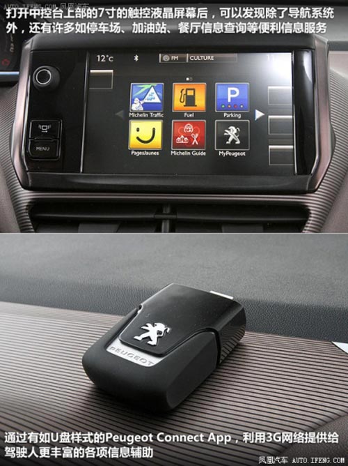 以現今車輛設計趨勢來看,除了基本的影音配備外,支持外接音源與USB插孔幾乎已經成了不可或缺之標準配備,2008在中控臺下方與中央鞍座銜接處,除了配置了置杯架外,還設計了車用12V電源插孔與兩個USB插槽,中間之USB插槽上,外接了一個像隨身碟的物品,這個其實是2008車載平臺最重要的部件。打開中控臺上緣7吋的觸控液晶屏幕后,可以發現除了導航系統外,還有許多如停車場、加油站、餐廳信息導覽等便利信息服務。