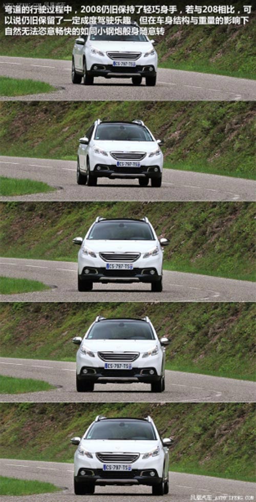 在前半段多爬坡的路段,1.6 e-HDi展現了柴油發動機的扭矩輸出優勢,23.5公斤米的扭力面對約莫1230公斤之車重,加上車內兩位乘員及隨身行李,總重約莫在1430公斤,爬坡時并不能用充沛來形容,但低速檔位加上稍為拉升的轉速 (約莫3500轉上下) 仍舊輕松以對。在彎道的激烈操駕,不若于高速道路上的輕巧沉穩,2008的底盤反應感覺較趨理性以對,如果較激烈的轉動方向盤,車頭指向性還算輕快,但車尾卻不會歇斯底里的隨傳隨進,而是會稍稍的瞬間猶豫一下,然后才會乖巧的跟進。