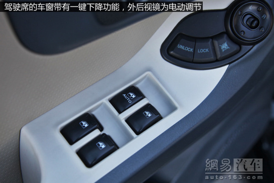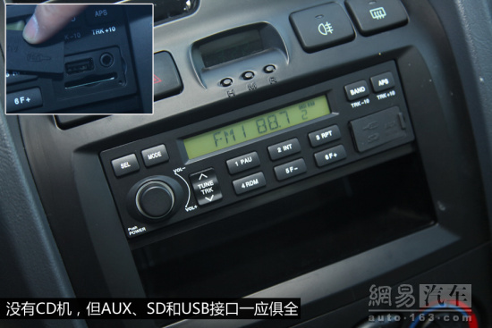車內的配置肯定算不上豐富,畢竟成本在那里擺著,但肯定還是達到了夠用的水平,比如缺失了CD機之后,AUX、SD和USB接口就都一應俱全了,仔細想想這年頭聽CD的人也確實不多了。內飾的布局相當簡單,同樣延續了車輛粗獷的整體風格,按鍵設計大都比較“魁梧”,上手幾乎沒有難度。