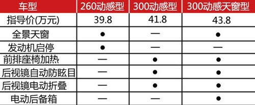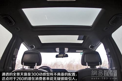 配置上260車型表現(xiàn)的并不低端,它延續(xù)了300動感型上的大部分功能,而且還配備了后者沒有的大面積全景天窗,這對于消費者來說肯定是吸引力十足。除此之外,260車型還增加了發(fā)動機啟停系統(tǒng),再加上排量更小的發(fā)動機,因此260車型的油耗表現(xiàn)勢必會提升很大。配置缺失方面,260車型少了座椅加熱、后視鏡電動折疊和自動防眩目功能,不過個人認為相比增加的全景天窗來說,這些配置不要也罷。