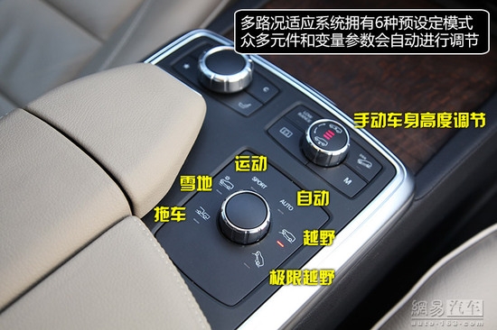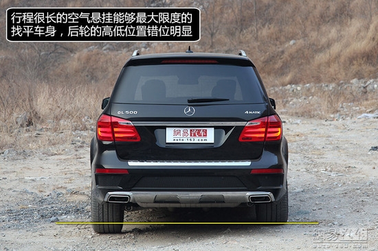 GL500 搭配了一套和 ML 高配車型幾乎一致的高度可調的空氣懸掛,以及共分為 6 種駕駛模式的多路況適應系統:拖車、冰雪、運動、自動、越野和增強越野模式。根據模式的不同,對車輛配置進行調整, 以針對當前的行駛狀況和路面條件做出最佳響應。眾多元件和變量參數會自動進行調節,其中包括發動機、變速箱、電控車輛穩定行駛系統( ESP )、四輪驅動電子牽引輔助系統( 4ETS )、加速防滑控制( ASR )、轉向系統、離地間隙、空氣懸掛和減震器。