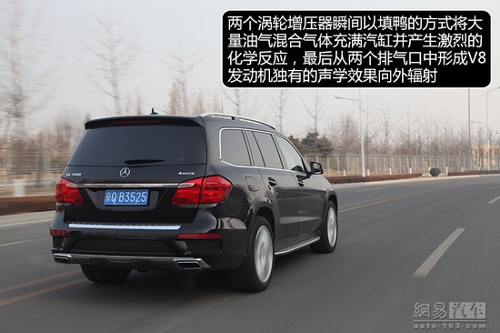 讓GL500在筆直的公路上全力沖刺則完全是另一番景象,兩個渦輪增壓器瞬間以填鴨的方式將大量油氣混合氣體充滿汽缸并產生激烈的化學反應,爆炸聲在消音器中不斷反射吸收,最后從兩個排氣口中形成V8發動機獨有的聲學效果向外輻射。而自始至終駕駛員和乘客都被恐懼地按在座椅上,直到完成整個加速過程。