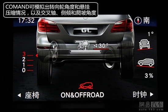另外,車身高度還可通過手動進行三級調節,它的正常離地間隙在 216mm 左右,將空氣懸掛抬至最高可獲得 304mm 左右的離地間隙,所以通過性非??捎^。駕駛員可通過 COMAND 多媒體系統實時觀測車輛此時四條車輪和懸掛的行程情況、轉向角度的模擬圖像。行車電腦應該還有一個陀螺儀,它可實時監測車身各個方位的傾斜角度,并作出數據統計,幫助駕駛員做出合理判斷。