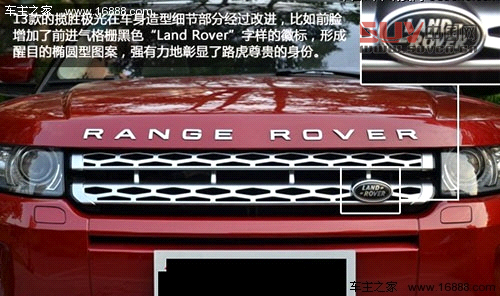 13款的攬勝極光在車身造型細節部分經過改進,比如前臉增加了前進氣格柵黑色“Land Rover”字樣的徽標,形成醒目的橢圓型圖案,強有力地彰顯了路虎尊貴的身份。