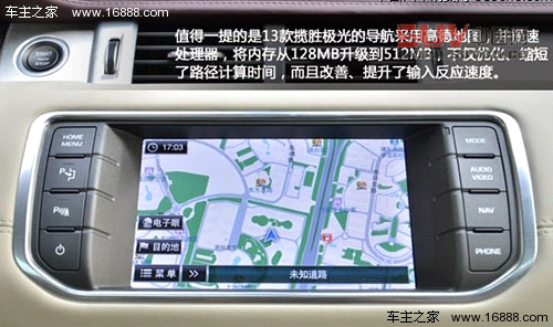 值得一提的是13款攬勝極光的導航采用高德地圖,并提速處理器,將內存從128MB升級到512MB,不僅優化、縮短了路徑計算時間,而且改善、提升了輸入反應速度。