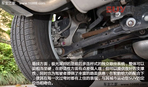 懸掛方面,極光采用的是前后多連桿式的獨立懸掛系統,整體可以說相當堅硬,在舒適性方面有點差強人意;但可以提供很好的支撐性,同時也為駕駛者提供了豐富的路面信息,在輪胎給力的配合下,使其在每一次過彎時都有上佳的表現,與其城市運動型SUV的定位也相吻合。