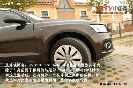 從外觀而言,Q5 2.0T FSI hybrid與普通Q5區別并不大。除了車身前翼子板兩側與尾部“hybrid”字樣的銘牌表明這是混動版,還有另外一個從外觀上判斷的依據,那就是相對而言造型上更為封閉一些的渦扇狀輪圈。