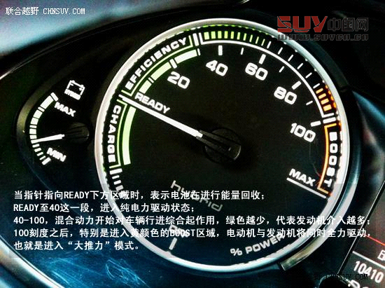 讓我們重點來看一下儀表盤左側的功率輸出狀態表:當指針指向READY下方區域時,表示電池在進行能量回收;READY至40這一段,進入純電力驅動狀態;40-100,混合動力開始對車輛行進綜合起作用,綠色越少,代表發動機介入越多;100刻度之后,特別是進入黃顏色的BOOST區域,電動機與發動機將同時全力驅動,也就是進入“大推力”模式。