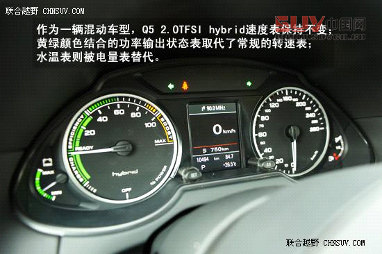 作為一輛混動車型,Q5 2.0TFSI hybrid速度表保持不變;黃綠顏色結合的功率輸出狀態表取代了常規的轉速表;水溫表則被電量表替代。
