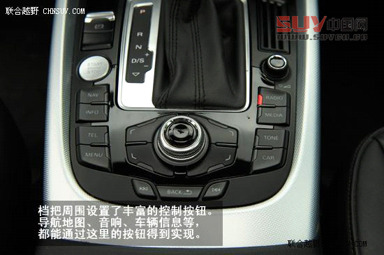中控臺與其它進口奧迪Q5并無太大差別。但我們可以發現,在單碟DVD下方,Q5 2.0TFSI hybrid配有混動車型獨有的EV鍵,也就是電動機驅動優先鍵,按下后車輛將以電機驅動,官方消息可以用60km/h的速度勻速純電動行駛3km,最大純電動行駛速度為100km/h。進口奧迪原有的駕駛模式調節鍵則被省略。